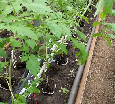 Wat als eerste opvalt is dat de tomatenplanten (nu ongeveer een meter hoog) niet in de grond staan, maar op plastic schaaltjes naast het plantgat. De kluit waar de plant op gezaaid is bij de plantenkweker zit er natuurlijk nog wel aan. Waarom wordt dat gedaan?
