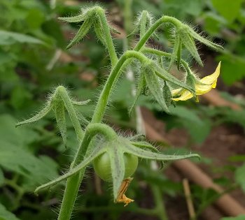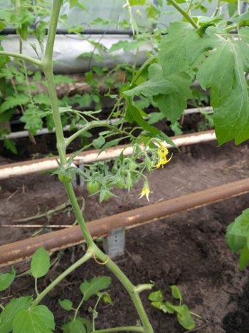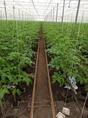 De tomaten hebben het best naar hun zin in de kas, het is er 24 graden en ze krijgen voeding in de vorm van biologische varkensgier in de pot gedruppelt. Daarom groeien de tomaten best snel. Als de planten al in de grond zouden staan, zouden ze te gelukkig zijn. En een gelukkige plant denkt nog niet aan zijn nageslacht. De planten zouden dan veel te veel blad gaan vormen en geen bloemen. En zonder bloemen natuurlijk geen tomaten! Vandaar dat de planten de eerste 10 weken nog niet in de grond gezet worden. Pas als de tweede tros bloeit worden de planten in de grond gezet. Daar zullen ze snel verder wortelen. Ze krijgen dan ook nog een gift biologische geitenstalmest om ze verder op weg te helpen en gezond te houden.